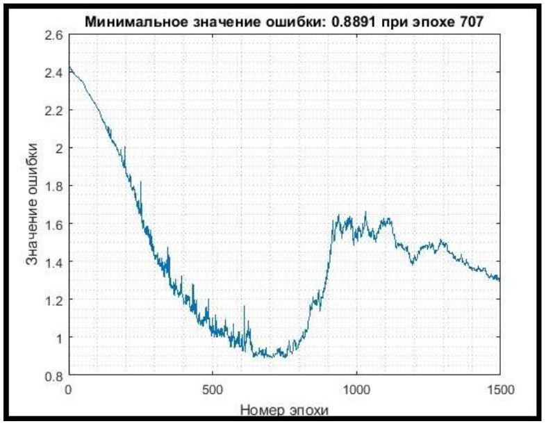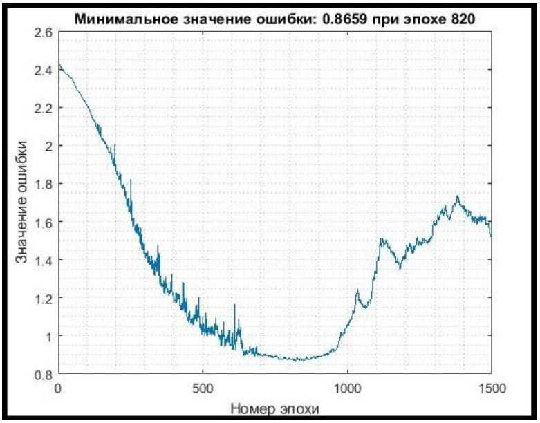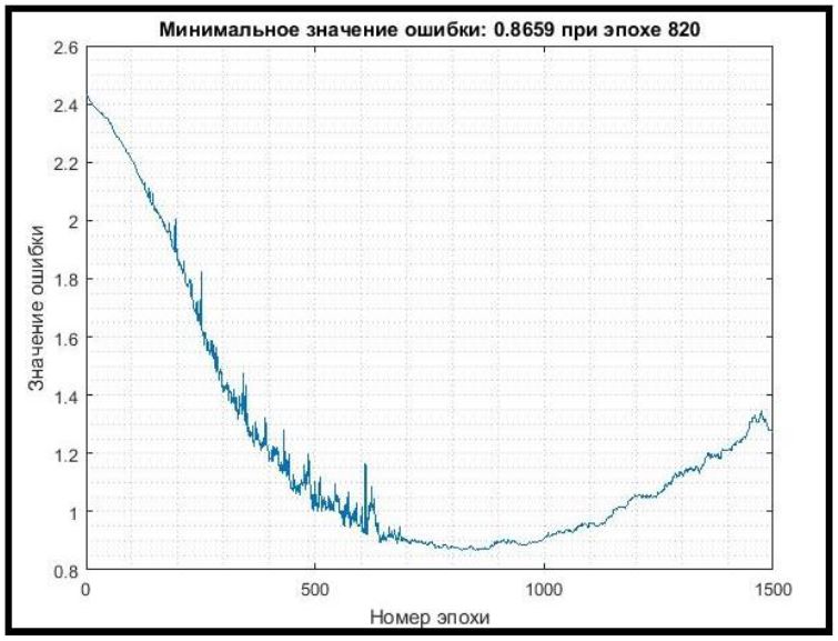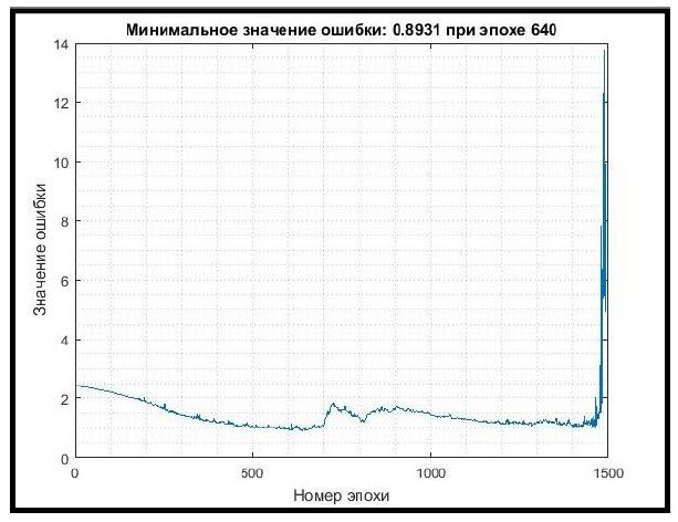Таким образом, в рамках выполнения задачи 2 была обучена сеть при начальном значении скорости обучения 0,01 и количестве эпох, равном 1500. В случае переобучения сети выбирался снимок сети на определенной эпохе с наименьшим значением ошибки. Затем процесс обучения продолжался уже при уменьшенной скорости обучения (0,004). В случае повторного переобучения сети данные действия повторялись (значения скорости обучения 0,002 и 0,001).