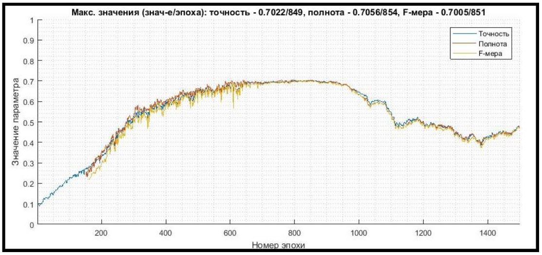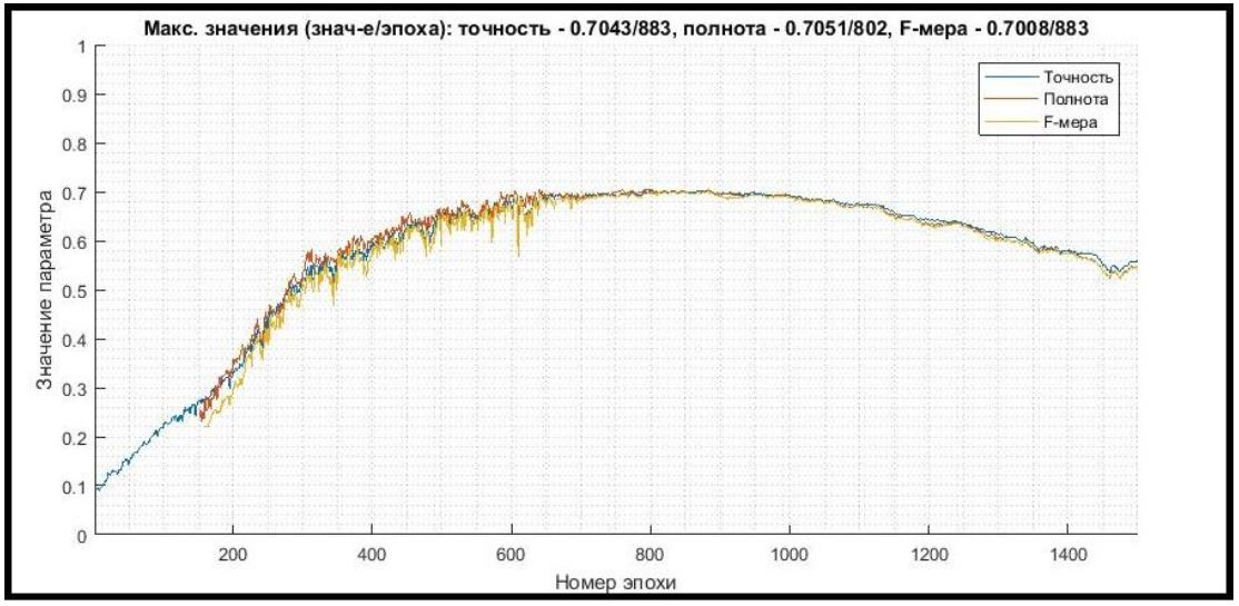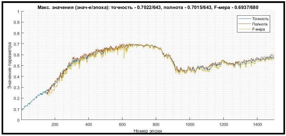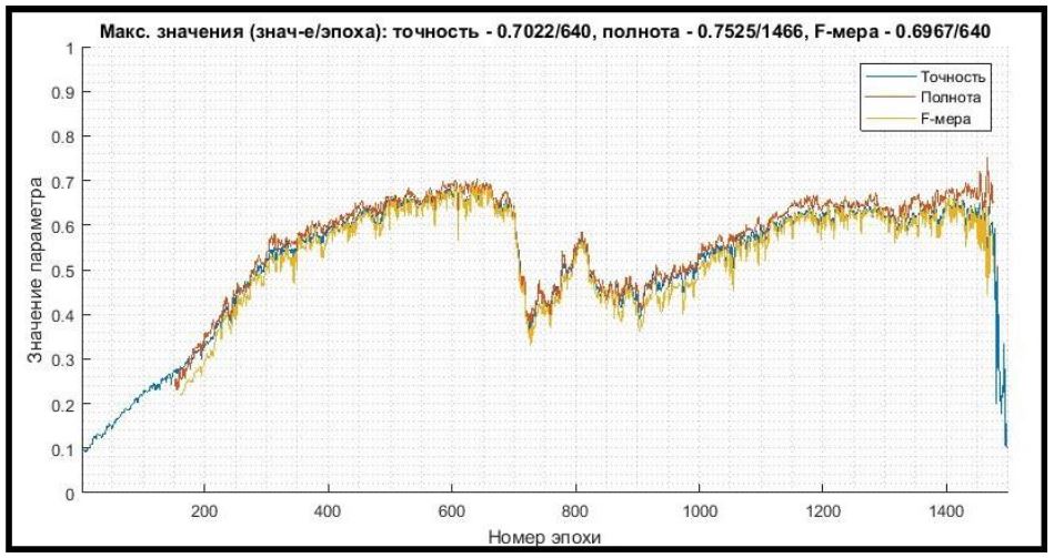 В процессе выполнения задачи 2 фиксировались значения следующих наиболее значимых выходных параметров обучения: ошибка сети, средние значения F-меры, точности и полноты.