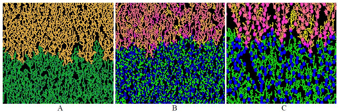 Here are indicated: T – layer temperature; ANi, BAl – the corresponding concentration of the components of the mixture in the layer; the coefficients k, L, and M can be set in the whole table space from the generated charge structure file [18], while the system is considered closed and adiabatic, and the heat capacity of pores is neglected. Figure 1 shows three versions of the reaction media: a clad powder (A), a mixture of powders of equal size (B), and a model for the Ni-Al system (C). The combustion wave propagates from above, the combustion region is highlighted in red, blue and green color correspond to the initial components of the mixture, yellow to the final synthesis products. So we get the configuration of the combustion front with the allocation of coordinates of hot particles, the temperature of which is dimensionless by the value of the maximum adiabatic temperature.