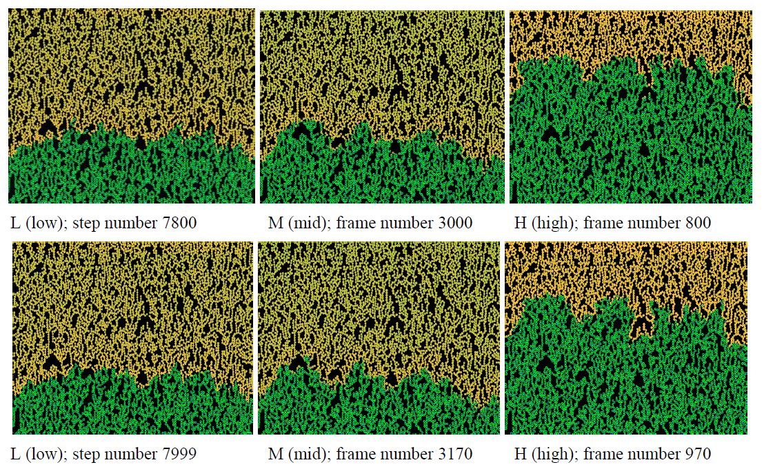 Cell numbers of the graphic screen with the coordinates of the hot particles are listed. After forming the list of boundary points for each of them, a list of the remaining boundary points of the cold particles of the starting products visible from it is compiled. This is checked by the criterion for the intersection of the line connecting the selected points with any other. If the line intersects, the point is considered invisible. When calculating, according to the Stefan-Boltzmann law: S = σT4, irradiation heat transfer for all boundary points, the correspondence of particle heating above the threshold temperature is checked. To do this, we believe that all effective heat transfer is carried out at a wavelength corresponding to the maximum density of thermal radiation, which is calculated according to the Wien displacement law: λmax = b T-1. Given that, the propagation of thermal radiation is limited in pores with a minimum diameter dmin, in accordance with the Kirchhoff diffraction limit: dmin = λmax / (2n), restrictions are imposed on the temperature of the hot powder particles. If it is above the threshold, then it is considered that such a particle participates in radiation heat transfer and this part of the heat is transferred to points that it can irradiate. Figure 2 shows the effect of radiation heat transfer on the burning rate and the geometric shape of the reaction wave front. The results of visualization of three scenarios are presented: L (“low”) – there is no irradiative heat transfer, for example, in an ultrafine powder; M ("medium") – radiation heat transfer of the order of 10 %, for example in ordinary fine powders; H (“high”) – the prevailing radiation heat transfer of more than 50 %, for example, in loose and poorly packed powder mixtures. The numbers indicate the iteration step number when simulating the propagation of a combustion wave. It can be seen that the speed increases significantly due to warming up in the cavities of the embankment. In the complete absence of heat transfer by radiation, combustion propagates along a chain of contacting particles.
