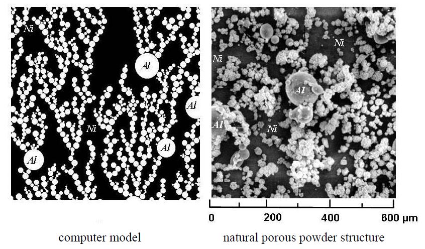 The adequacy of the results of computer modeling by equations (1) and (2) was checked using the porous structure of the initial mixture of Ni and Al powders as an example, as shown in Figure 6.