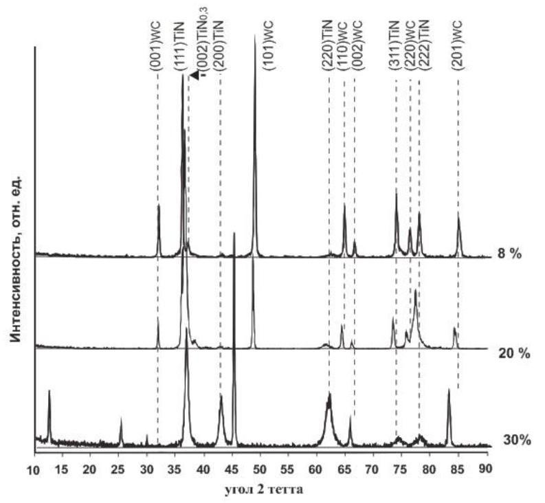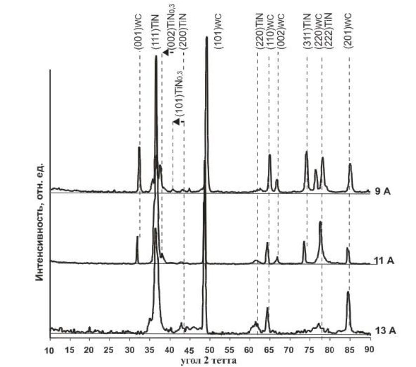 Фазовый состав покрытий TiN изменяется в зависимости от содержания N2 и величины разрядного тока. Увеличение содержания N2 и разрядного тока приводит к изменению фазового состава покрытий TiN, заключающегося в снижении объемной доли гексагональной фазы h-TiN0,3 и формированию однофазного покрытия на основе кубической фазы (111) с-TiN с максимальной степени тестурированности покрытия.