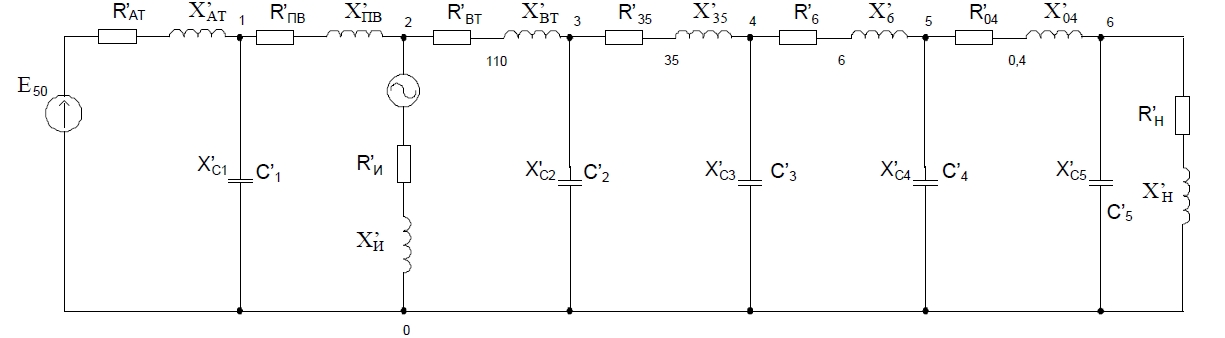 На исследуемом объекте к шинам 0,4 кВ подключена нагрузка, питаемая через преобразователи напряжения. Для оценки возможности существования резонансных режимов (резонанса токов) в исследуемой системе на основании имеющейся схемы электрической сети составим схему замещения. Схема замещения исследуемой электрической сети приведена на рисунке 2.