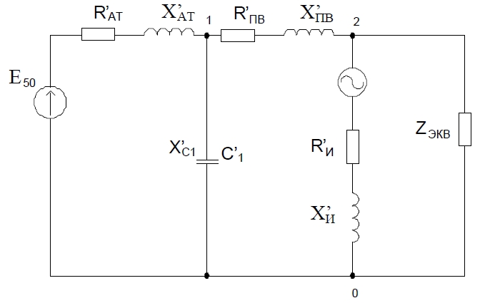 В результате преобразования правая часть схемы замещения будет представлять собой одно эквивалентное сопротивление (ZЭКВ) в операторной форме. Левая часть схемы замещения содержит следующие элементы: активное (RАТ) и индуктивное (XАТ) сопротивления автотрансформатора, установленного на подстанции 1 (ПС 1), активное (RПВ), индуктивное (XПВ) сопротивления и емкость (C1) ЛЭП, связывающей ПС 1 и секции шин (СШ) распределительного пункта (РП), активное (RИ) и индуктивное (XИ) сопротивления источника высших гармоник и источник питания (E50). Полученная схема замещения представлена на рисунке 3, а параметры её элементов – в таблице 1.