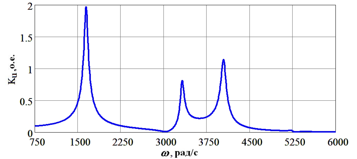 Графические зависимости кратности перенапряжения от частоты для различных классов напряжения представлены на рисунках 4–7. Максимальные кратности перенапряжения (KU), частоты, на которых возможен режим резонанса (f) и порядок ВГ, на частотах которых возможен резонанс (n) при различных классах напряжения (U) (в различных точках рассматриваемой сети), представлены в таблице 2.