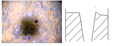 - в виде язв (рис. 6). Коррозия протекает на небольших участках поверхности в форме локальных поражений. Опасность ее заключается в разрушении металла при незначительной потере общего веса. Поражение занимает небольшие участки поверхности, и обнаружить его сложнее, чем сплошную коррозию, что в дальнейшем может привести к образованию свища.