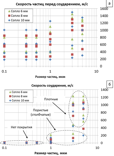 Частицы размером 3-5 мкм практически во всех режимах (за исключением наиболее низкоскоростного Gпл=1 г/с) при соударении с поверхностью имеют высокую скорость 400-1200 м/с, потеря скорости в пограничном слое составляет 100-400 м/с. Такие высокие значения скорости на практике обеспечивают формирование покрытий с высокой плотностью. При низкой скорости потока частицы размером 3-5 мкм имеют низкую скорость соударения до 200 м/с, которая приводит к формированию пористых покрытий.