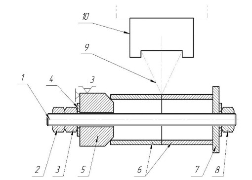 Рисунок 1. Приспособление для лазерной сварки труб. 1 – Шпилька, 2 – Гайка, 3 – Контр-гайка, 4 – Шайба, 5 – Конусный упор, 6 – Стыкуемые трубы, 7 – Зажимная шайба, 8 – Зажимная гайка, 9 – Схема фокусировки лазера, 10 – Лазерная сварочная голова Kugler.