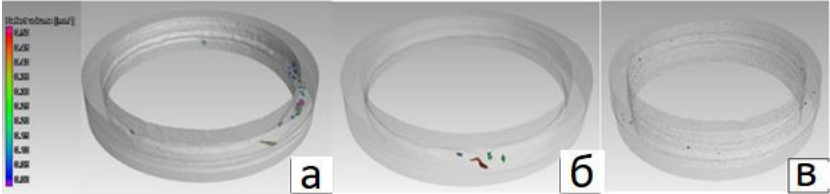 Рисунок 6. 3D-снимок трубы, сделанный с помощью рентгеновского томографа: а – скорость подачи проволоки 2.2 мм/с, б – 2.6 мм/с, в – 3 мм/с.