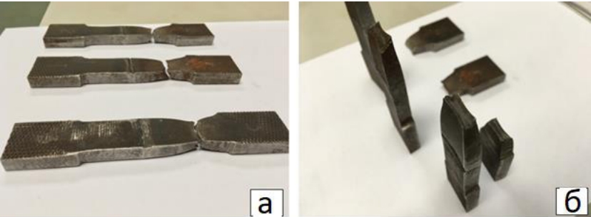 В нашем случае, при соблюдении рекомендаций, предложенных в работе, значение предела прочности при разрыве усредненном значении трех образцов со швом оказалось на 2 % меньше, чем значение прочности образцов без шва. При этом разброс значений при испытании не превышал 5 %. Вид образцов после разрушения в результате их испытаний на статическое нагружение (рисунок 8).