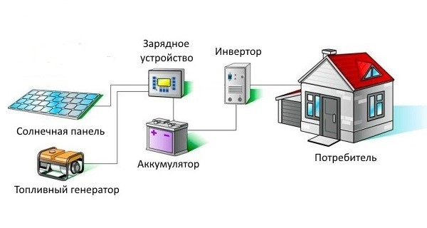 Такой вариант обеспечения электроэнергией особенно актуален для отдаленных уголков страны или труднодоступных мест, куда трудно или финансово невыгодно проводить традиционные сети. В свою очередь гибридная солнечная электростанция представляет собой комбинированный комплект из солнечных панелей и аккумуляторов, а сама система подключена к топливному генератору (Рис. 1) [8].