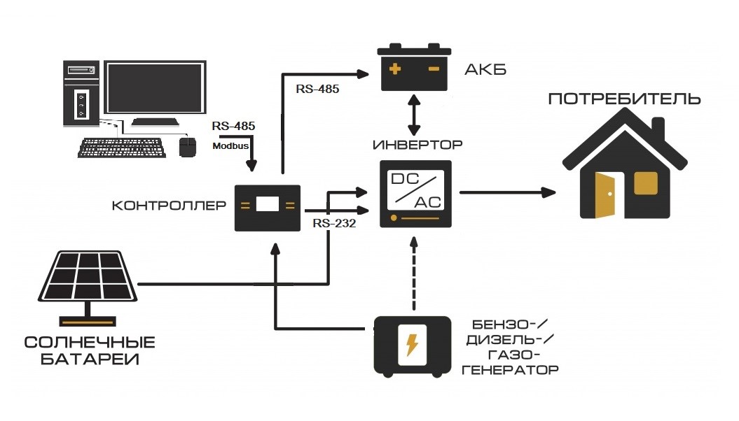 Система гибридной СЭС работает по следующему принципу: вся преобразованная солнечными батареями (СБ) солнечная энергия подается в систему электроснабжения для питания нагрузок переменного тока через сетевой инвертор. Основными функциями обратимого инвертора (способен потоки энергии направлять в обоих направлениях) являются заряд аккумуляторных батарей (АКБ) от дизель- или газопоршневого генератора и производство электроэнергии для нагрузки, преобразованной от АКБ в случае нехватки или отсутствия солнечной энергии.