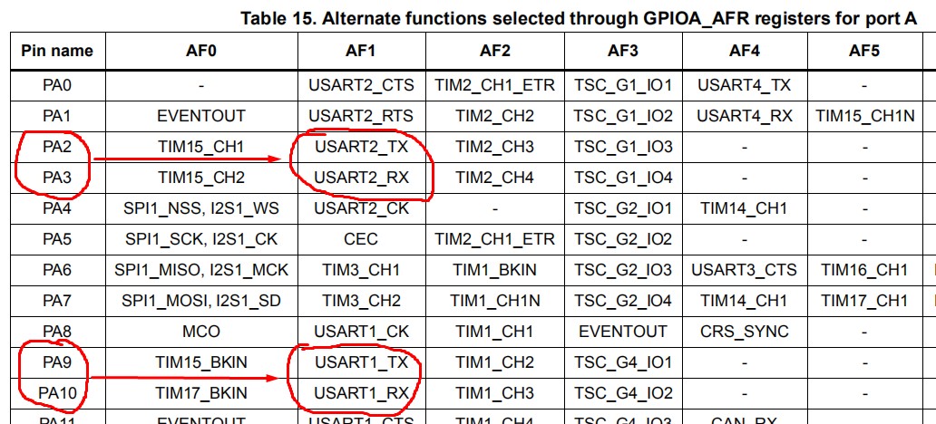 Так как порты микроконтроллера универсальные и имеют несколько функций, кроме настройки самого модуля UART, необходимо настроить порты на соответствующую альтернативную функцию. За это отвечают регистры GPIOA->AFR. Номер функции выбираем по документации (рисунок 3).