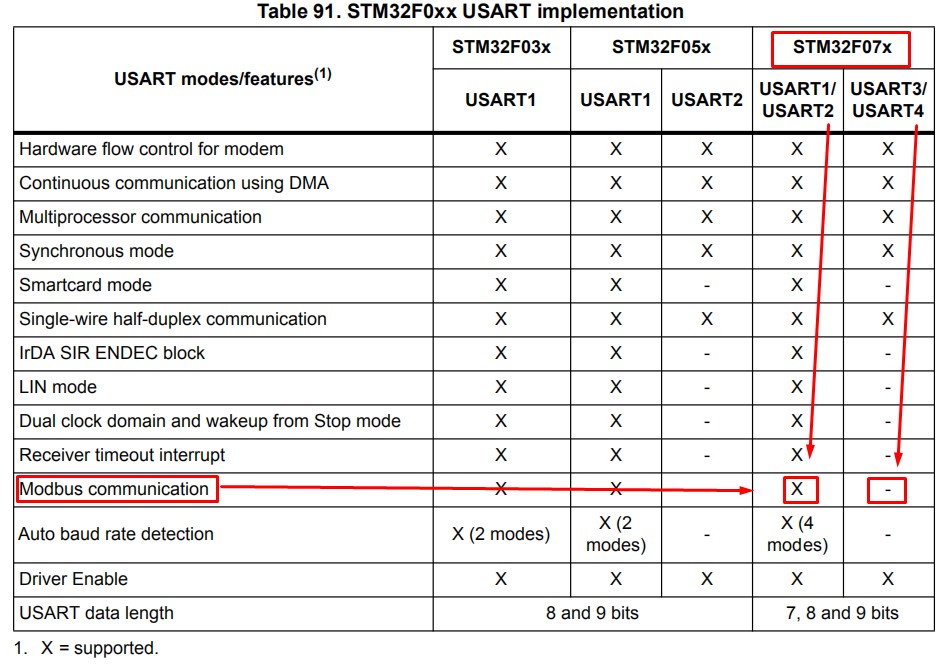 Разные поля структуры используются в различных функциях системы. По стандарту ModBus окончание посылки фиксируется по таймауту 3,5 символа. В микроконтроллерах STM32F07х у UARTa есть поддержка данного протокола, которая заключается в вызове прерывания по таймауту, но она доступна только для UART1 и UART2 (рисунок 4).