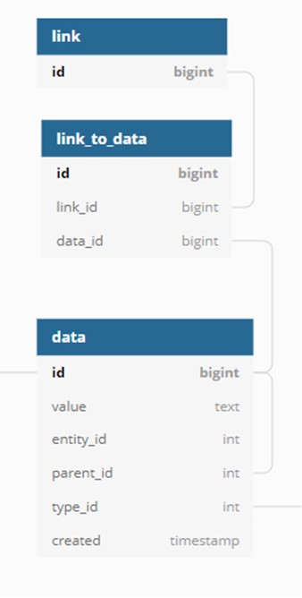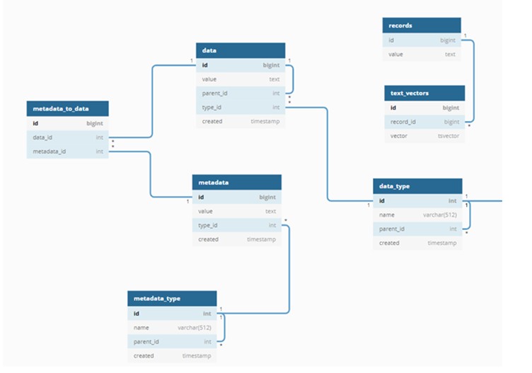 Неструктурированные данные располагаются в таблицах базы данных data, data_type, metadata, metadata_type с учетом таблиц их связей (см. рисунок 1).