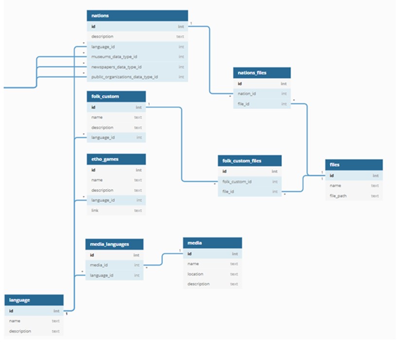 Хранение структурированных данных устроено по стандартным принципам реляционной базы данных. На данный момент осуществляется хранение следующих сущностей и их связей: народы; файлы; этнические игры; языки; СМИ. Схема реляционной базы данных представлена на рисунке 3.
