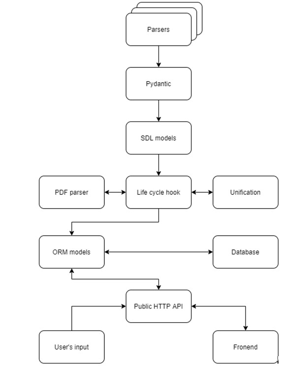 Полученные данные проходят валидацию с помощью Pydantic с целью исключения ошибок формирования записи. После чего данные переводятся в формат базы данных, сохраняя структуру и связь элементов. С помощью life cycle hook определяется завершение предыдущего этапа и происходит обработка входных данных, а именно унификация и извлечение текста из файлов формата PDF. Под унификацией понимается приведение написания текстов различных вариантов языка к единому для возможности поиска и структурирования данных. При унификации создается одноуровневая связь между исходным документом и унифицированным, которая описана ранее.
