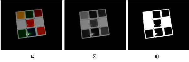 Из исходного изображения 5а получается монохромное изображение. Потом изображение претерпевает размытие по Гауссу в целях избавления от шумов 5б. Далее из монохромного изображения, содержащего полутона серого цвета, строится изображение, содержащее только белый и черный цвета 5в.