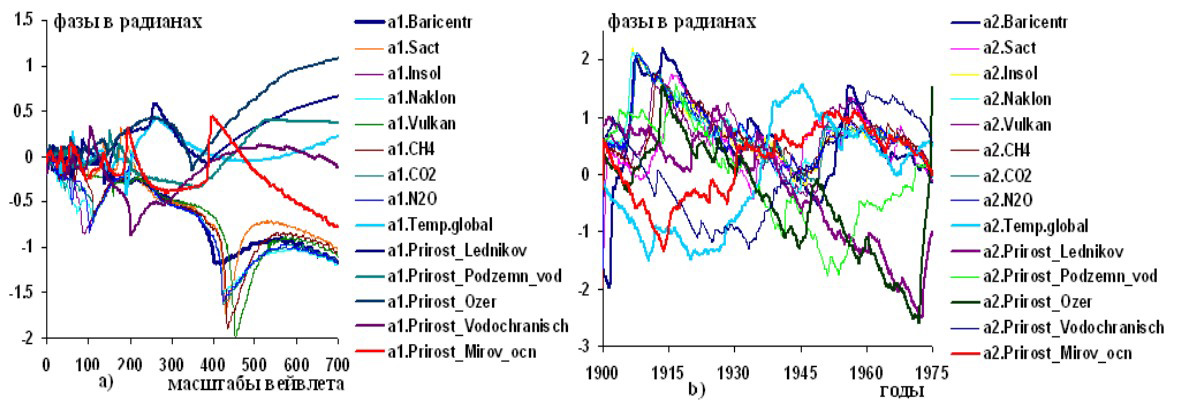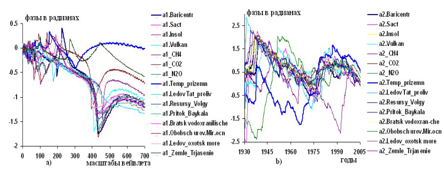 Рисунок 5 – Графики изменений вейвлетных: a) и b) фазо-частотных и фазо-временных характеристик гелиокосмических (Baricentr, Sact, Insol, Vulkan, CH4,CO2,N2O), климатической приземной температуры (Тemp.prizemn) и составляющих водного баланса: ледовитостей Татарского пролива (Ledov Tat.proliv) и Охотского моря (Ledov oxotsk more), ресурсов Волги (Resursy Volgy), притоков Байкала (Pritok Baykala), уровня Братского водохранилища (Bratsk vodoxranilische), обобщенного уровня Мирового океана (Obobch urov.Mir.ocn) по наблюдениям за переменными в 1930,2-2005,4 гг.