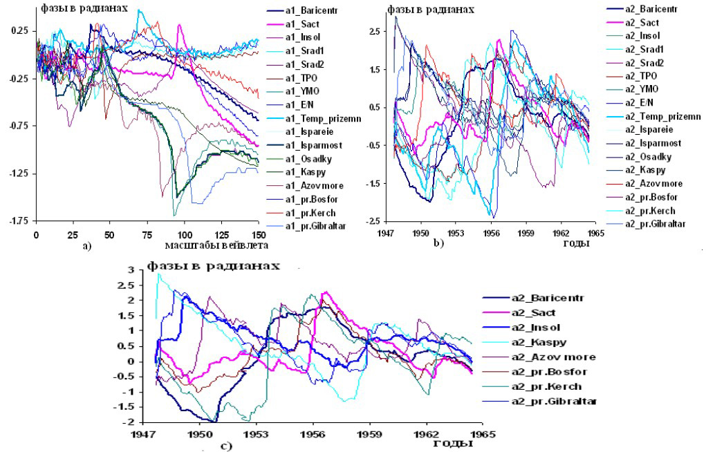Рисунок 2 – Графики изменений вейвлетных: a) и b) фазо-частотных и фазо-временных характеристик групп взаимодействующих факторов и переменных: гелиокосмических (Baricentr, Sact, Insol), климатических (Srad1, Srad2, TPO, YMO, E/N,, Temp.prizemn), тепловых и водных ресурсов на суше (Isparene, Isparayemost, Osadky), cоставляющих водного баланса южных морей Европы (Kaspy, Azov.more, pr.Bosfor, pr.Kerch, pr.Gibraltar); с) вейвлетных фазо-временных характеристик гелиокосмических переменных и cоставляющих водного баланса южных морей Европы по наблюдениям в 1947,7-1964,4 годы