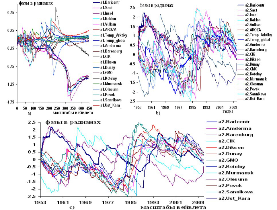 Рисунок 6 – Графики вейвлетных: a) и b) фазо-частотных и фазо-временных характеристик гелиокосмических (Baricentr, Sact, Insol, Naklon, Vulkan, Aroza), климатических (Temp.Arktiky, Temp.global) и составляющих уровней Северного Ледовитого океана по данным измерений в прибрежных станциях океана: Amderma, Barenburg, CIK, Dikson, Dunay, GMO, Kotelny, Murmansk, Olesunn, Pevek, Sannikova, Ust Kara; с) вейвлетные фазовые характеристики барицентрических движений Солнца (Baricenr) и составляющих уровней Северного Ледовитого океана по данным измерений в прибрежных станциях океана по наблюдениям в 1953,2-2010,7 гг.