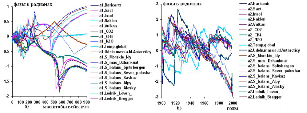 Рисунок 7 – Графики изменений вейвлетных: a) и b) фазо-частотных и фазо-временных характеристик гелиокосмических переменных (Baricentr, Sact, Insol,Naklon, Vulkan, CO2, CH2, N2O) климатической переменной Temp.global и балансов масс льдов в ледниковых районах: удельной массы льдов в Антарктике (Udeln.mass.ldov.Antarktiky), суммарного баланса морских льдов в Северном полушарии (S.mass.Sever.polushar), балансов ледников: Джангитау (mass.Dzhankuat), Шпицбергена (balans.Spitsberger), Кавказа (balans.Kavkaz), Альп (balans.Alpy), Аляски (balans.Alasky) Ловена Среднего (Lednik.Loven), Бреггера Восточного (Lednik.Bregger) по наблюдениям в 1900,8-1999,6 гг.