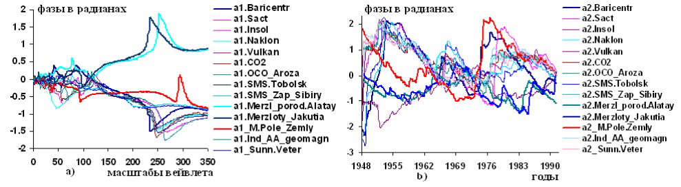Рисунок 8 – Графики изменений вейвлетных: a) и b) фазо-частотных и фазо-временных характеристик гелиокосмических (Baricentr, Sact, Insol, Naklon, Vulkan, CO2, OCO_Aroza) и некоторых составляющих межсезонных оттаиваний грунтов в криолитозонах континента: мощности сезонно-мерзлотного слоя (СМС) на метеостанции Тобольск (SMS.Tobolsk), на 10 метеостанциях Западной Сибири (SMS.Zap.Sibiry), мощности мерзлых толщ в районе перевала Жусалы-кезен, хребта Заилийский Алатау (Merzl.porod.Alatay) и мерзлот в Якутии (Merzloty. Jakutia), магнитного поля Земли (M.pole.Zemly), индекса геомагнитной активности АА (Ind.AA.geomagn), солнечного ветра (Sunn.Veter)