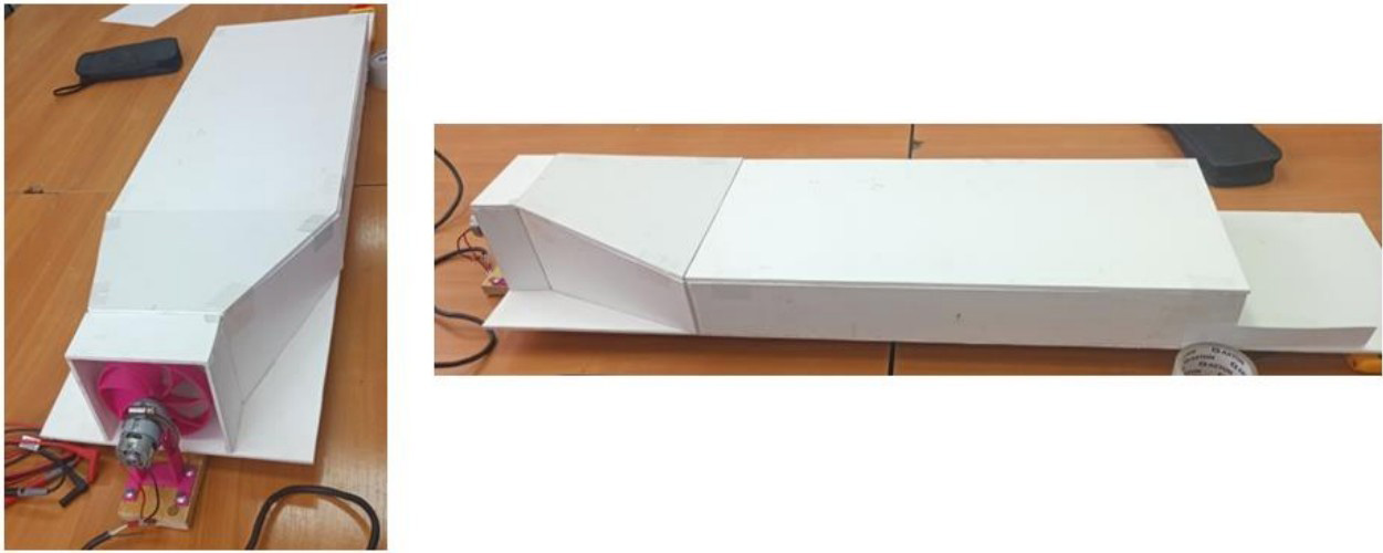 Для определения влияния угла атаки ветра на нагрев и охлаждения самонесущего изолированного провода СИП 3 сечением 16 мм2 были проведены экспериментальные исследования. На рисунке 1 представлен общий вид экспериментального стенда, который условно можно разделить на 2 составляющих: первый – «силовой блок» и второй – аэродинамическая труба (рисунок 2) с блоком управления скоростью ветра (рисунок 3). В основе «силового блока» лежит модифицированный трехфазный трансформатор 220/110 В. В ходе эксперимента была задействована только одна фаза. Изменение тока через образец провода производилось при помощи лабораторного автотрансформатора, к выводам вторичной обмотки которого был подключен силовой трансформатор.