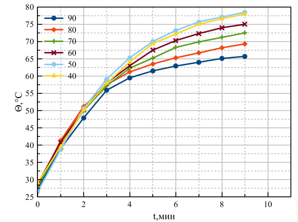 На рисунке 9 представлены графики изменения температуры при изменении угла атаки ветра. Из данного графика можно отметить, что при изменении направления ветра температура возрастает, а также можем сделать вывод о том, что на 9 минуте при углах 40 ° и 60 ° разность между температурой жилы и температурой изоляции незначительна и составляет не более 3 °C. С течением времени, при достижении стационарного режима, разность составляет не более 0,5 °C. Время достижения стационарного режима для каждого угла разное, поэтому был сделан срез на 9 минуте для большей наглядности.
