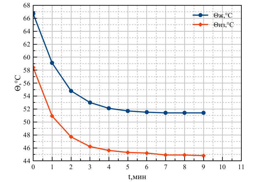 В ходе экспериментального исследования были получены зависимости изменения температуры провода с течением времени при различных углах. На рисунке 7 представлены изменения температуры жилы и изоляции при угле 90°, а на рисунке 8 – при угле 50°. Из представленных рисунков видно, что на 9 минуте разность между температурой жилы и температурой изоляции составляла от 4 до 8 °C, что соответствует ранее предложенным гипотезам.