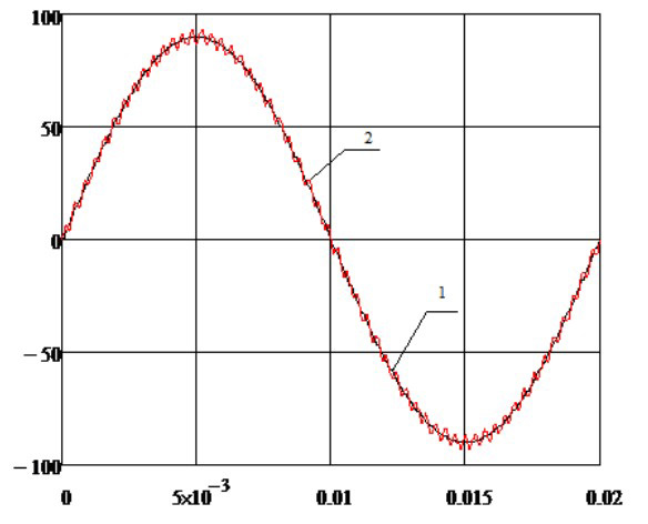Ток на резонансной частоте в защищаемых линиях 4 (рис. 2) будет измеряться ферритовыми датчиками тока 8. На рисунке 4 показаны результаты моделирования в Mathcad работы рассматриваемого метода селективного определения отходящей линии, ток промышленной частоты 50 Гц обозначен «1», а суммарный ток в поврежденном присоединении обозначен «2».