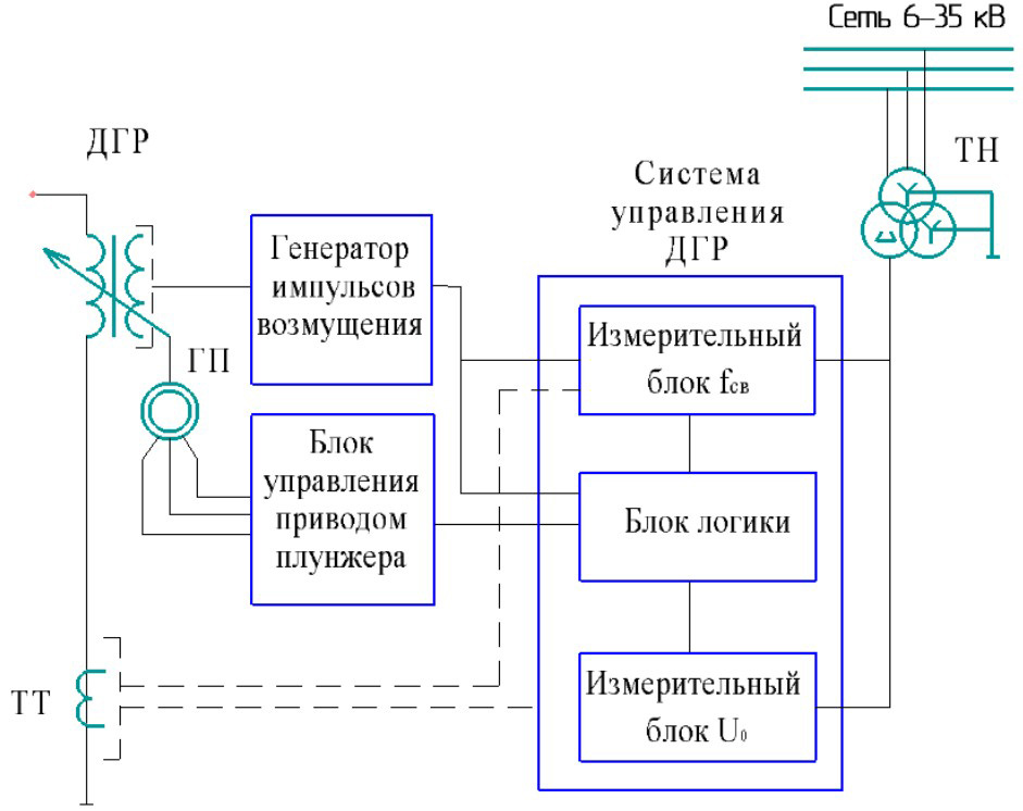 На принципиальной схеме управления плунжерным дугогасящим реактором (рис. 2) в цепи силовой обмотки реактора установлен трансформатор тока. Для обратной связи по напряжению используется обмотка трансформатора напряжения с схемой соединения «разомкнутый треугольник». Блок логики определяет алгоритм взаимодействия измерительных блоков и блока управления приводом плунжера. Генератор импульсов возмущения, подключенный к сигнальной обмотке ДГР, имеет прямую связь с измерительным блоком частоты свободных колебаний в контуре нулевой последовательности и связь через блок логики.