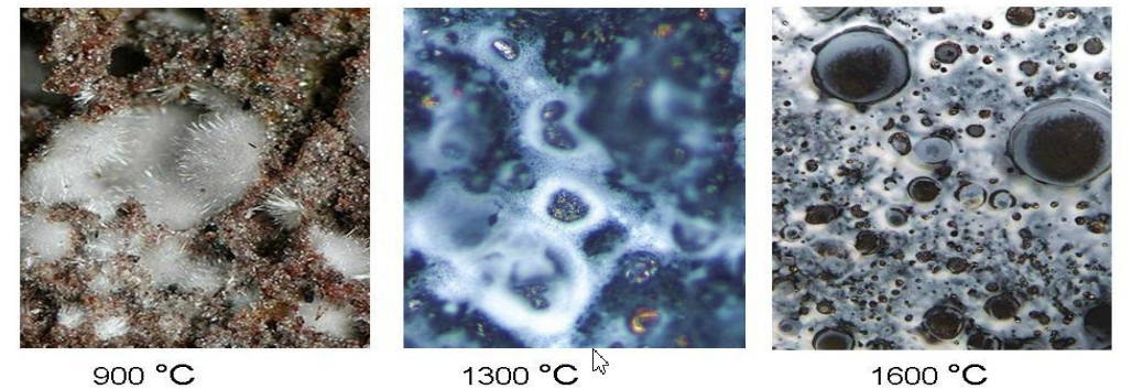 Как было указано ранее, на температуре 125 ºС производилась вакуумная сушка БШ в шкафу ШСВ-65, далее в печи ПВК-1,6 при температуре 550 ºС проходил отжиг связанной воды из алюмосиликатов, а затем проходил синтез с разными начальными температурами Т0, которые повышалась от 900ºС для первой партии до 1600ºС. По завершению последнего участка программируемого нагрева охлаждение образцов проходило в соответствии со штатным режимом охлаждения печи. На рисунке 5 показано, как с повышением температуры обжига выше 1300ºС меняется цвет спеченных образцов от коричневого до белого, что свидетельствует об интенсивном формировании муллитовых структур в материале.