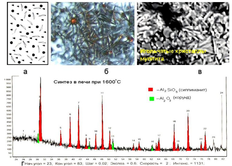 Процессы эволюции фрагментарной структуры муллитовых огнеупорных материалов при росте температуры синтеза (а), а также результаты оптической (б) и сканирующей электронной микроскопии (в) приведены на рисунках 6–8. Детальный рентгеноструктурный анализ продуктов отражен на вставках (г).