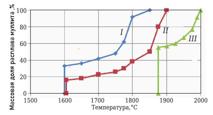 Рисунок 10 – Кривые плавления различных типов муллитов [4], в зависимости от стехиометрического соотношения Al2O3 : SiO2, равного 1 : 1 (I), 6 : 4 (II) и 9 : 1 (III)