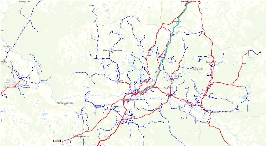 Рисунок 1 – Схема размещения трубопроводов на территории ХМАО: магистральные – красные линии; промысловые – синие линии
