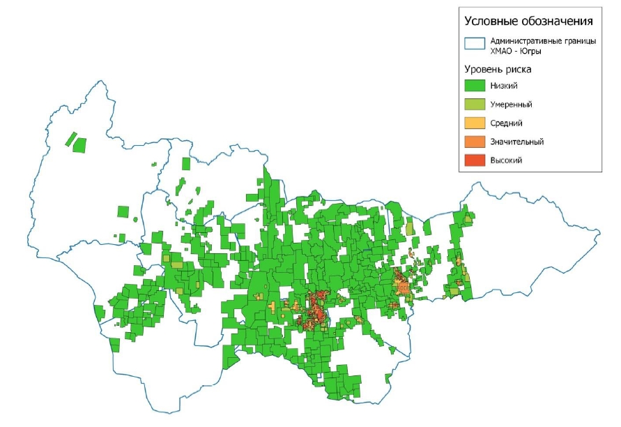 Рисунок 2 – Цифровая карта оценки рисков аварийных разливов нефти на территории Ханты-Мансийского автономного округа