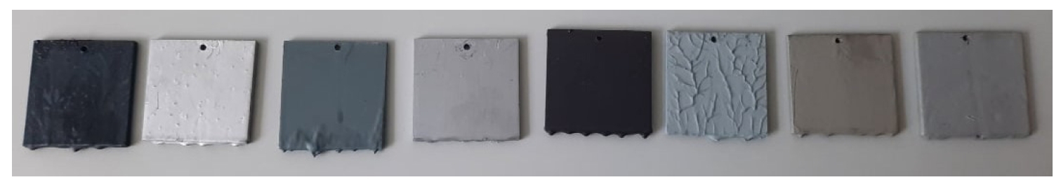 Выборка образцов (рисунок 5) лакокрасочных материалов следующая: эпоксидные композиции, кремнийорганические композиции, силиконоакриловое покрытие и композиция на основе полиуретанового лака. Отметим, что один из образцов получил своеобразный рисунок в процессе сушки покрытия, что является технологической особенностью для кремнийорганического покрытия с добавлением цинка в его состав [16–17]. Более широкая выборка покрытий обусловлена тем, что были получены сведения с нефтеперерабатывающих комплексов города Уфы об опытных испытаниях силиконакриловых покрытий и составов на основе полиуретанового лака в качестве альтернативы кремнийорганическим покрытиям.