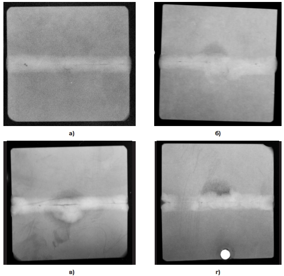Рисунок 8. Радиографический контроль сварных образцов: а) АМг2; б) АМг2-10%TiC; в) АМг6; г) АМг6-10%TiC.