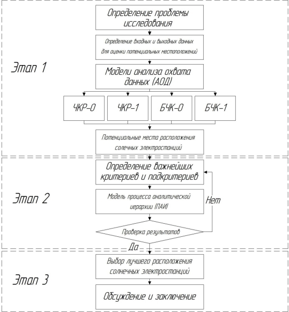 В этой статье предлагается комбинированный подход АОД и ПАИ для оценки солнечных ресурсов с учетом различных качественных и количественных факторов. Для демонстрации эффективности модели используется тематическое исследование солнечной энергетики Европейской части России. Результаты этого исследования могут стать важным материалом для заинтересованных сторон в области возобновляемых источников энергии для ускорения их развития в свете быстрого технического прогресса, национальных обязательств по охране окружающей среды и целей устойчивого развития. Поскольку инструменты, использованные в исследовании, могут быть применены в любой точке мира, это исследование может стать полезным руководством для других исследователей, правительств или частных инвесторов.