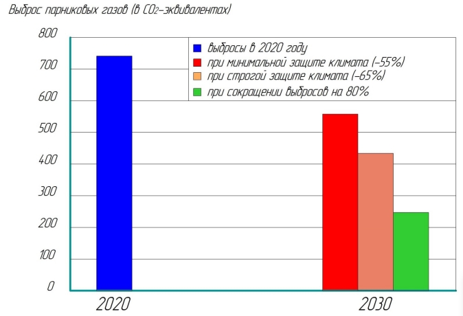 Необходимо сократить выбросы парниковых газов к 2030 году минимум на 80 % по сравнению с 1990 годом (рис. 2). Это соответствует значению ниже 250 млн т CO2/год к 2030 году в качестве целевого показателя на пути к климатической нейтральности. Следует отметить, что при достижении поставленной цели не учитывается экспорт или импорт электроэнергии, чтобы рассмотреть максимально безопасный сценарий.