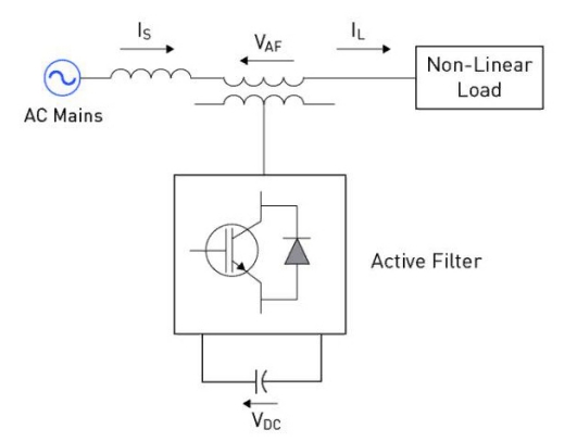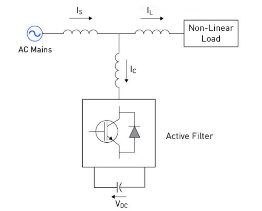 Активные фильтры используются для устранения гармоник в энергосистемах. В отличие от пассивных фильтров, которые используют компоненты реактивной мощности (конденсаторы и катушки индуктивности) для создания пути для гармонических токов, активные фильтры работают за счет подачи токов, равных по величине, но противоположных по фазе гармоническим токам, присутствующим в системе [6].