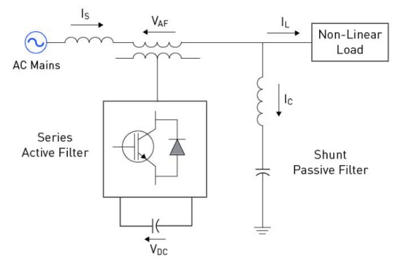Гибридные активные фильтры представляют собой комбинацию как шунтирующих, так и последовательных фильтров, обычно включающих пассивный фильтр. Такая конфигурация позволяет одновременно снижать как гармоники тока, так и напряжения. Активная часть фильтра обрабатывает гармоники более высокого порядка с переменной частотой, в то время как пассивная часть обрабатывает гармоники более низкой частоты с фиксированной частотой. Гибридные активные фильтры используют преимущества как последовательных, так и шунтирующих фильтров, сводя к минимуму их недостатки. Топология гибридного активного фильтра мощности показана на рисунке 6.