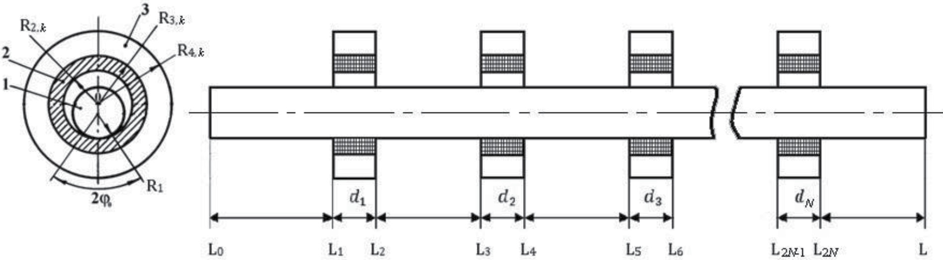 Рассмотрим систему подшипников, изображенную на рисунке 1. Здесь стальной вал (1) совершает вращающее движение, упираясь на N подшипников скольжения, состоящих из полимерных втулок (2) и стальных корпусов (3).
