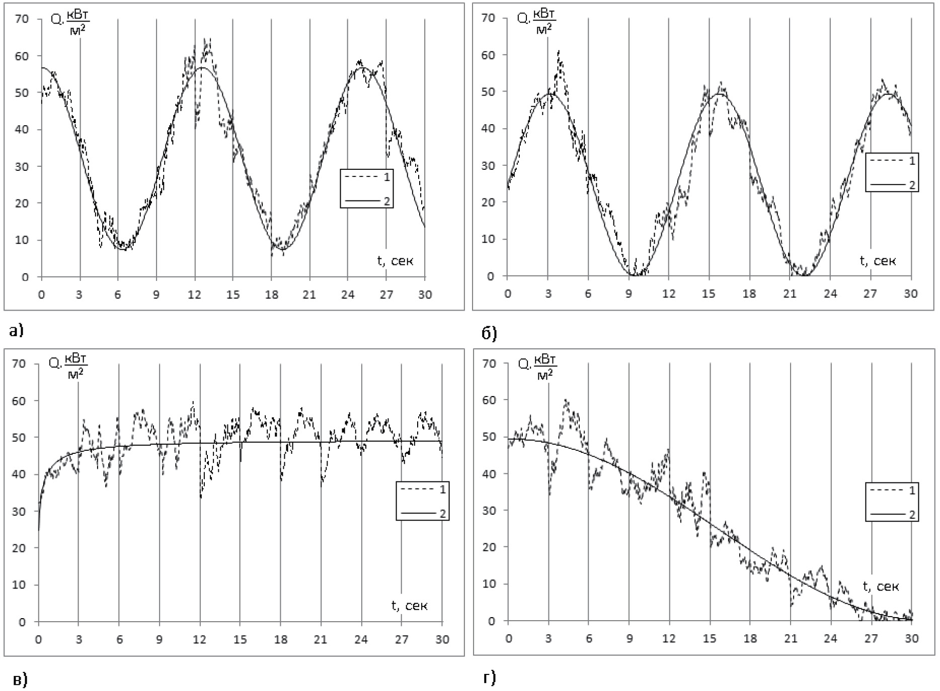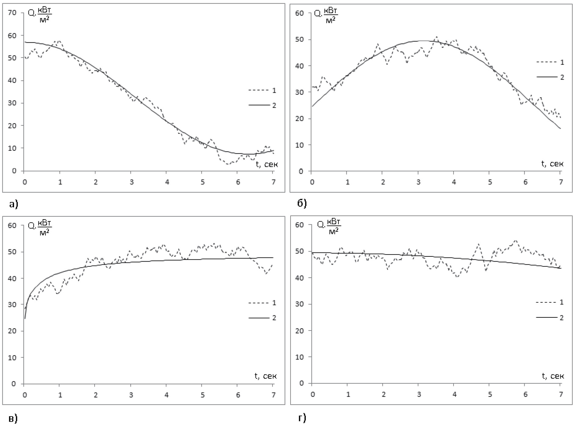 Рисунок 3. Сравнение заданных (2) и восстановленных (1) функций удельных интенсивностей теплообразования решением обратной задачи по температурным данным с погрешностями на полном временном промежутке с разбиением на полуинтервалы по 3 с: а) – в первом подшипнике; б) – во втором; в) – в третьем; г) – в четвертом