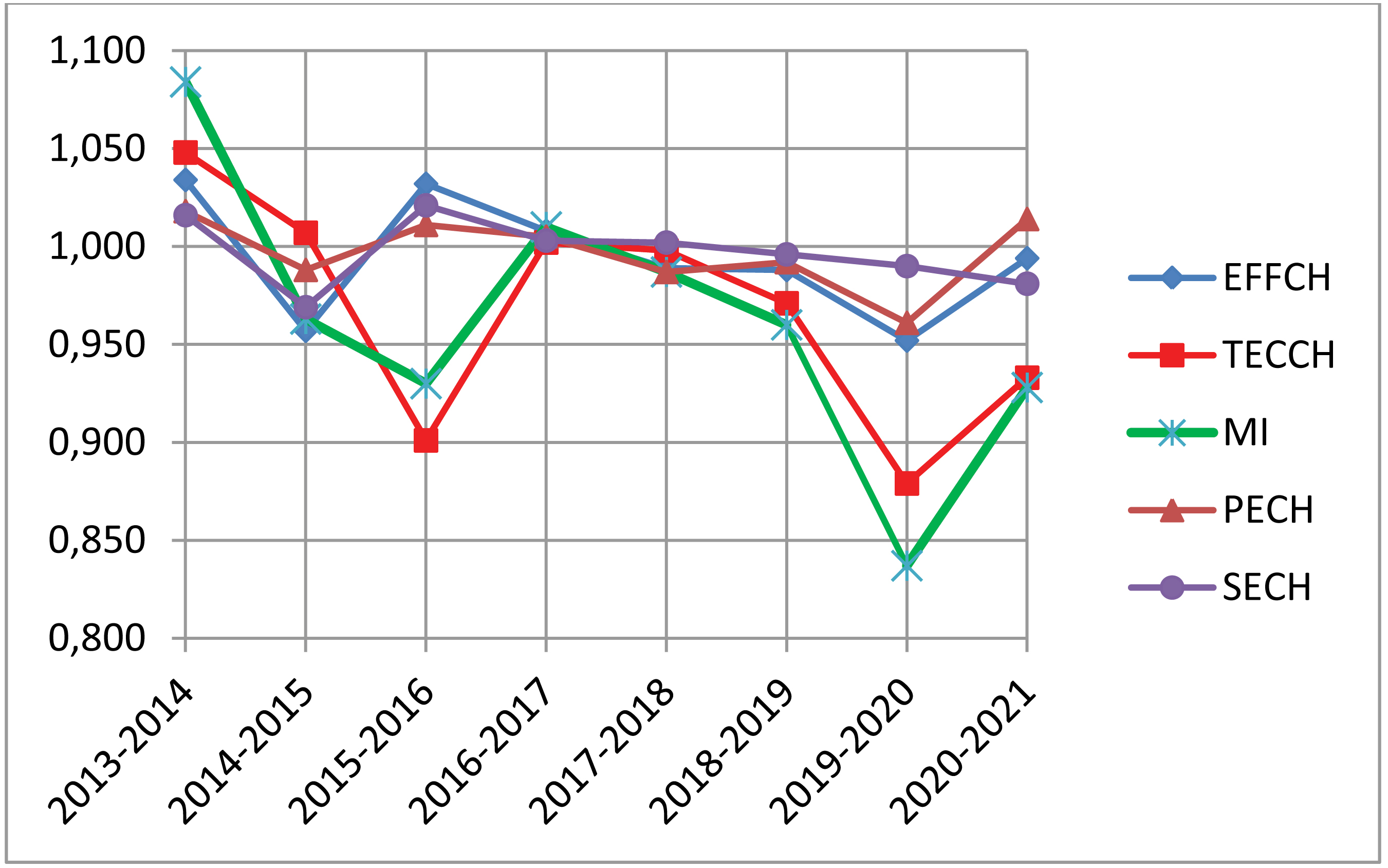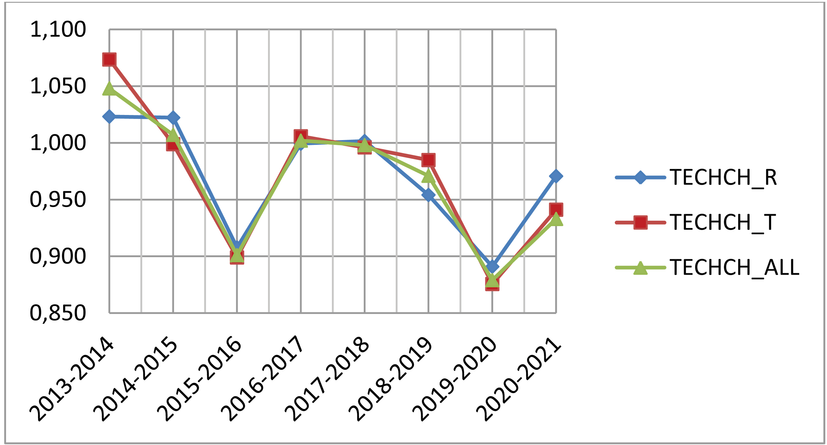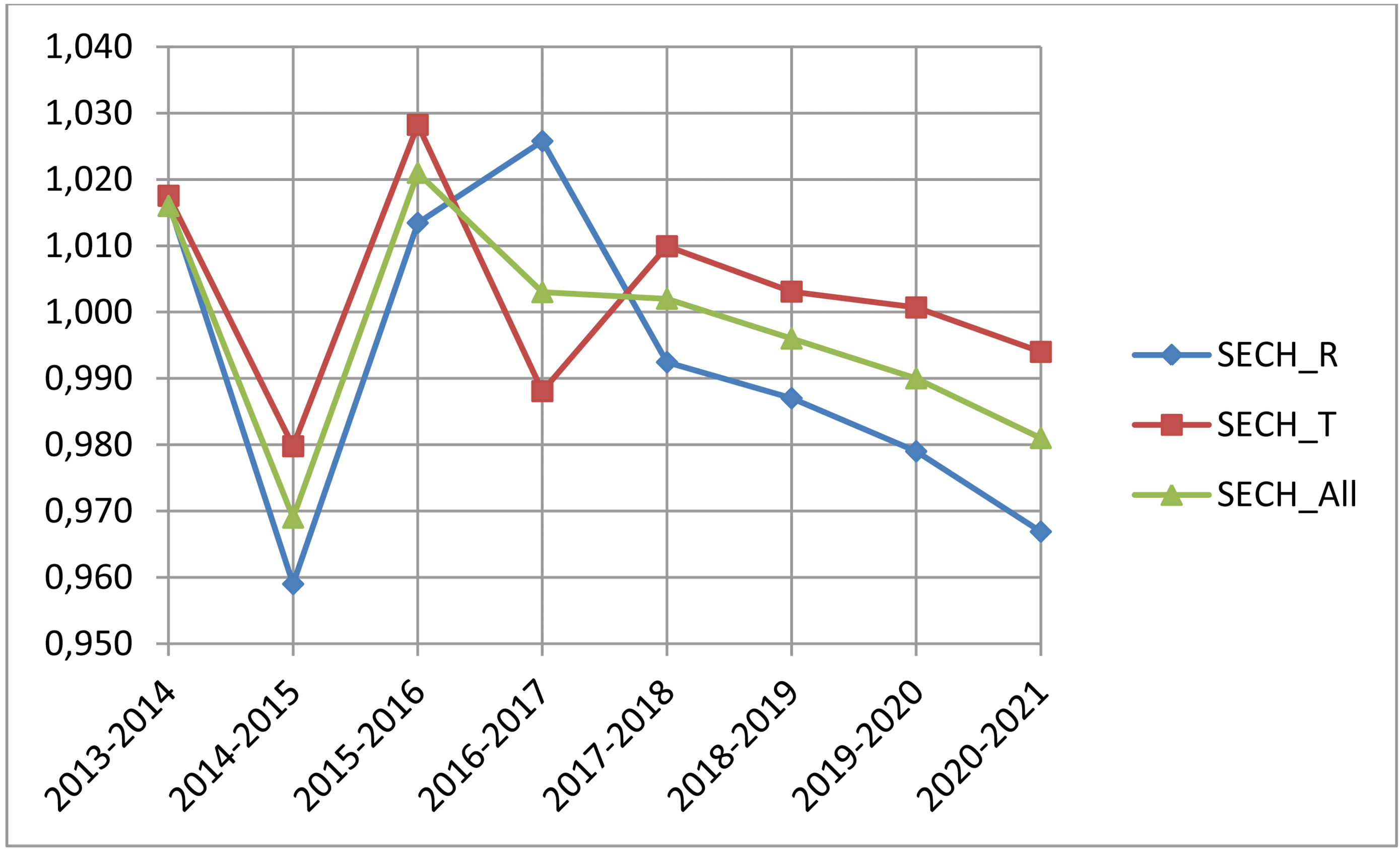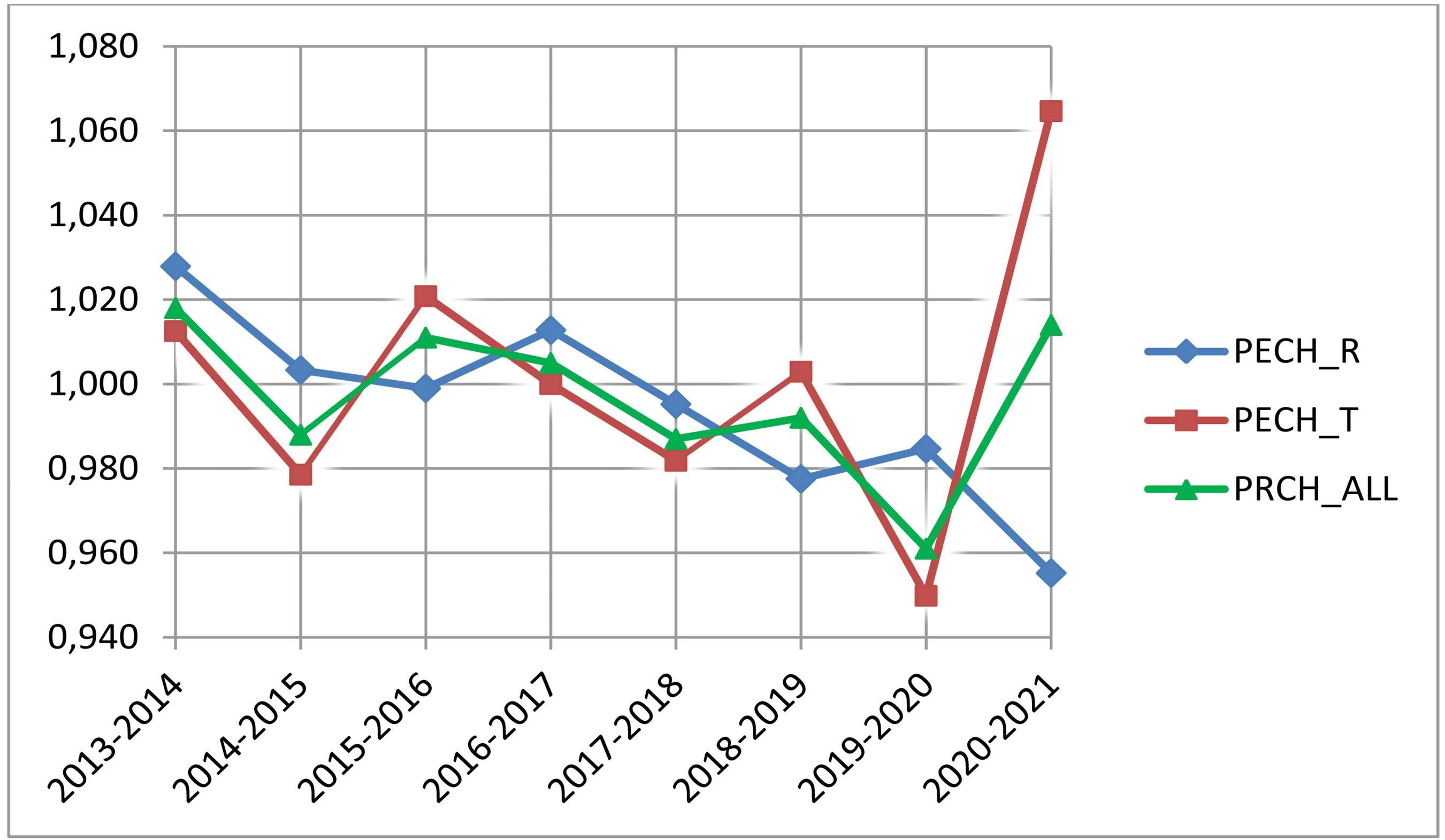 Интерпретация значений величин TECCHjt,t+1, PECHjt,t+1, SECHjt,t+1 аналогична интерпретации значений MIjt,t+1. Оценка значений TECCHjt,t+1, PECHjt,t+1, SECHjt,t+1 осуществлялась с помощью свободно распространяемого программного обеспечения ПО DEAP 2.1 (https://economics.uq.edu.au/cepa/software) [15]. Для упрощения записей в дальнейшем предлагается использовать следующие обозначения: TECCHjt,t+1 = TECСHj, PECHjt,t+1 = PECHj, SECHjt,t+1 = SECHj. Для средних значений данных компонент по группе DMU «j» будет отсутствовать.