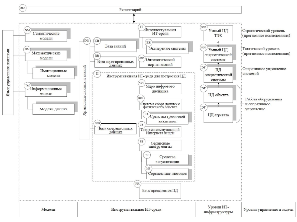 Представленная архитектура ИТ-инфраструктуры отражает модели, программные компоненты и технологии для четырех уровней ИТ-инфраструктуры (агрегат, объект энергетики, энергетическая система и ТЭК в целом) и соответствующих уровней управления (оперативное управление объектами и агрегатами; оперативное управление энергосистемами; тактический и стратегический уровни управления).