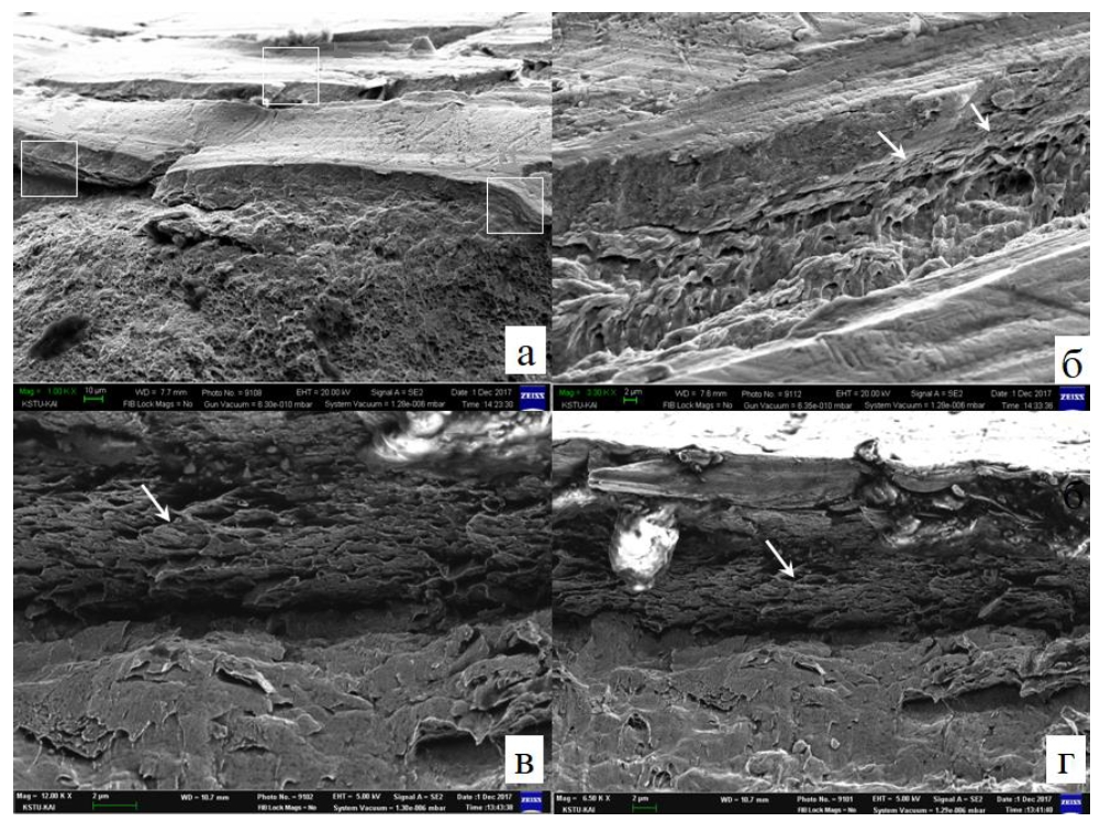 На рисунке 6 представлена фрактография разрушения компактных образцов полученных методом прямого лазерного нанесения проволоки с одновременным ультразвуковым воздействием.