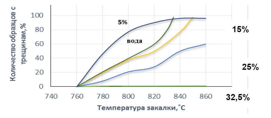 Рисунок 2 – Влияние температуры закалки и концентрации полимера в растворе на образование трещин в дисковых образцах с канавкой из стали У10