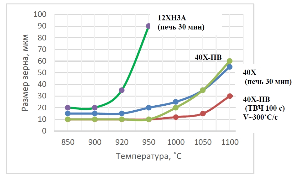 Ключевые показатели свойств деталям придаются в результате их поверхностного упрочнения после нагрева ТВЧ [12-15]. Учитывая скоростной нагрев и неизбежность нагрева поверхности деталей до более высокой температуры, чем при печном нагреве, в работе выполнены исследования и установлена температурная зависимость роста зерна в стали 40Х-ПВ (рис. 3). Видно, что в случае печного нагрева интенсивный рост зерна в стали наблюдается при температуре 920˚С, а в случае нагрева токами высокой частоты – при 1000˚С. Эти сведения указывают на сохранение мелкозернистого строения стали в сердцевине изделия, которое было сформировано при термической обработке полуфабрикатов, и получение мелкого зерна в поверхностном упрочненном слое после закалки с нагрева ТВЧ.